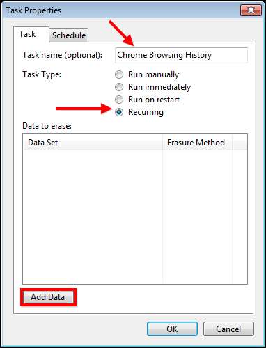 ایک نیا ٹاسک بنائیں ، ٹاسک کو ایک نام دیں ، پھر حذف کرنے کے لئے شیڈول کمانڈ منتخب کریں اور آخر میں فولڈرز کی وضاحت کے ل “" ڈیٹا شامل کریں "پر کلک کریں۔