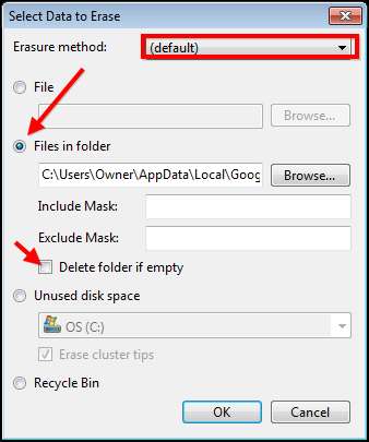 اب آپ حذف کرنے کا طریقہ منتخب کرسکتے ہیں یا صرف اس طرح چھوڑ سکتے ہیں جیسا کہ پہلے سے طے شدہ طریقہ استعمال کرنا ہے۔ وہ فولڈر منتخب کریں جہاں آپ کی کروم براؤزنگ کی تاریخ کو ذخیرہ کیا گیا ہے۔ آخر میں ، "فولڈر حذف کریں تو خالی کریں" کے اختیار کو غیر منتخب کریں۔