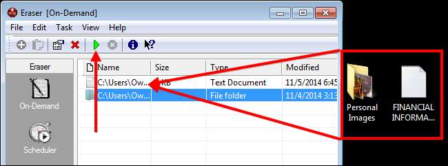 ایک بار جب آپ ایپ کھول چکے ہیں تو وہ فائلیں ڈھونڈیں جنہیں آپ ونڈوز ایکسپلورر کا استعمال کرتے ہوئے محفوظ طریقے سے حذف کرنا چاہتے ہیں اور انہیں ایریزر ونڈو میں گھسیٹیں۔ فہرست میں شامل ہونے کے بعد ، فائلوں کو محفوظ طریقے سے حذف کرنے کے لئے گرین پلے کے بٹن پر کلک کریں۔
