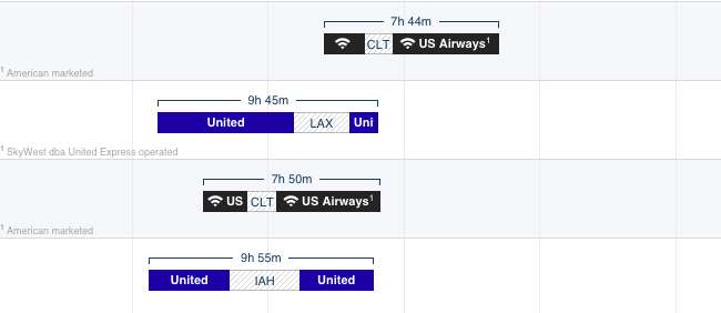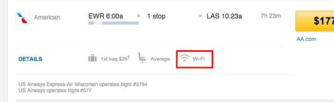 ٹکٹ کے مقابلے کی سائٹیں عام طور پر یہ معلومات پیش کرتی ہیں ، اور انفرادی ایئر لائن کی بکنگ سائٹس کو بھی چاہئے۔ اگر آپ کی ٹکٹ بک کرنے والی ویب سائٹ اس کی پیش کش نہیں کرتی ہے تو ، ایک مختلف ویب سائٹ پر سوئچ کریں۔ مثال کے طور پر، ہپ منک Wi-Fi آئیکن کے ساتھ Wi-Fi کے ساتھ پروازیں دکھاتا ہے۔ ذیل کے اسکرین شاٹ میں ، ایسا لگتا ہے کہ یو ایس ایئر ویز اس راستے پر دونوں پروازوں پر وائی فائی پیش کرتی ہے ، جبکہ یونائیٹڈ نہیں کرتا ہے۔