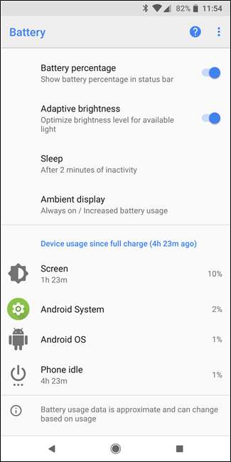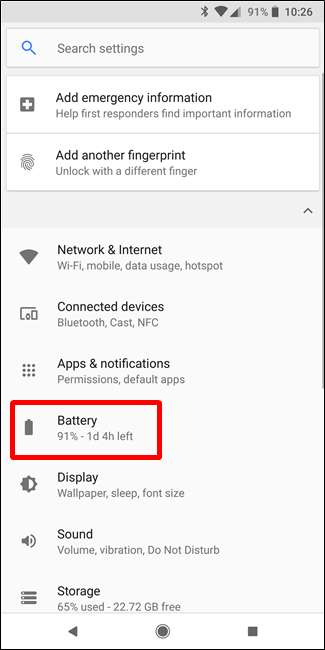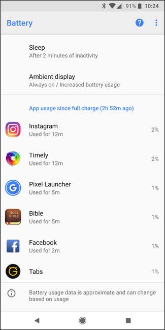 اینڈرائڈ کے پرانے ورژن (نوگٹ اور اس سے پہلے) پر ، آپ کو بیٹری خارج ہونے والی معلومات کے ساتھ ایک چارٹ مل جائے گا ، اور اس کے نیچے صرف اس بات پر ایک نظر ڈالیں کہ بیٹری کیا کھا رہی ہے۔ Oreo اور اس سے اوپر ، بیٹری کی متعدد ترتیبات فہرست کے اوپر نظر آتی ہیں ، لہذا آپ کو اسے دیکھنے کے لئے نیچے سکرول کرنے کی ضرورت ہوگی۔