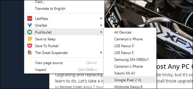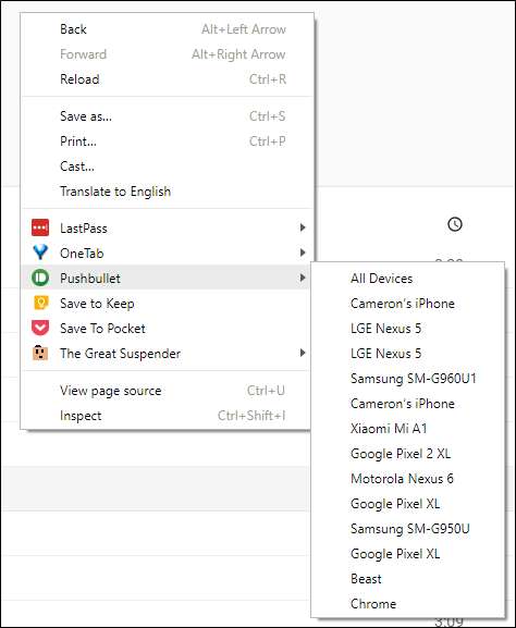 ہر چیز کو دونوں سروں پر چلانے کے ساتھ ، ویب پیج پر دائیں کلک کریں جس پر آپ اپنا فون بھیجنا چاہتے ہیں ، سیاق و سباق کے مینو میں پشبللیٹ پر جائیں اور اپنے آلے کو منتخب کریں۔ اور ، بام! یہ فوری طور پر آپ کے فون پر پشبللیٹ ایپ میں ایک لنک کے بطور ظاہر ہوتا ہے۔
