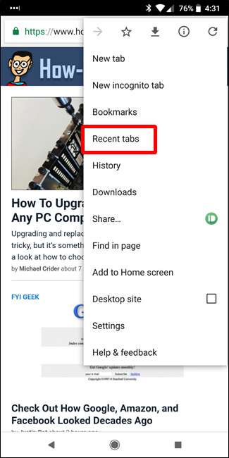 اپنے فون پر ، آپ اپنے کمپیوٹر پر کروم براؤزر میں کھلی ٹیبز تک رسائی حاصل کرسکتے ہیں۔ بس ترتیبات کا مینو کھولیں ، اور پھر "حالیہ ٹیب" کمانڈ کو تھپتھپائیں۔