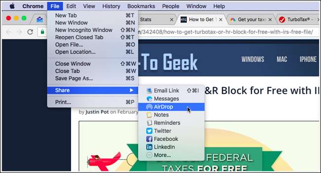 اگر آپ میک اور آئی او ایس صارف ہیں تو ، آپ مذکورہ بالا سب کو نظرانداز کرسکتے ہیں اور صرف ایر ڈراپ استعمال کرسکتے ہیں۔ اپنے میک پر کروم میں کھلا صفحہ کے ساتھ ، صرف فائل> شئیر> ایئر ڈراپ پر جائیں۔