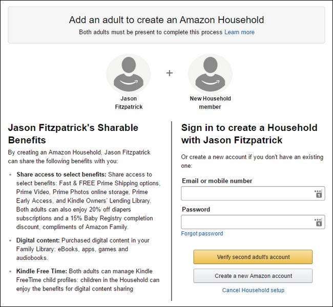 آپ کے گھر کے دوسرے بالغ فرد کو بھی ان کے اپنے ایمیزون لاگ ان اور پاس ورڈ کی ضرورت ہوگی اگر ان کے پاس پہلے سے ہی ایک پاس ورڈ نہیں ہے (یہ لاگ ان ، یقینا، پرائم ایبلڈ ہونے کی ضرورت نہیں ہے)۔ آپ کو بچوں کے لئے الگ الگ لاگ ان کی ضرورت نہیں ہے کیونکہ ایمیزون والدین کے اکاؤنٹ کے پروفائل پر مبنی ذیلی اکاؤنٹس کے طور پر چائلڈ اکاؤنٹس کو سنبھالتا ہے۔