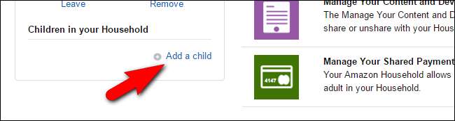 اپنے ایمیزون اکاؤنٹ میں بچوں کے پروفائل کو شامل کرنے کے ل you ، آپ وہی کنٹرول پینل استعمال کریں جس میں ہم ابھی موجود تھے۔ بائیں ہاتھ والے مینو کے نیچے "بچہ شامل کریں" کو منتخب کریں۔