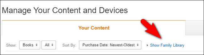 ایسا کرنے کے لئے ، پر جائیں ایمیزون اپنے مواد اور آلات کا نظم کریں صفحہ "آپ کا مواد" ٹیب پر ، "فیملی لائبریری دکھائیں" کو منتخب کریں۔