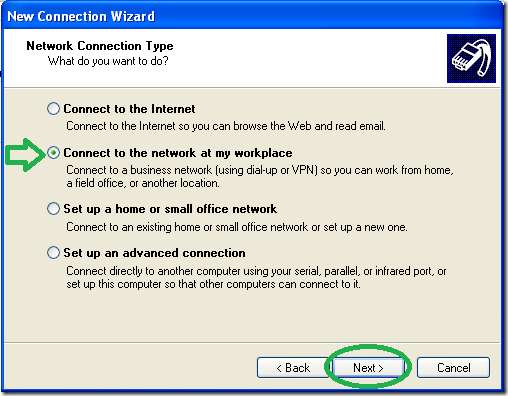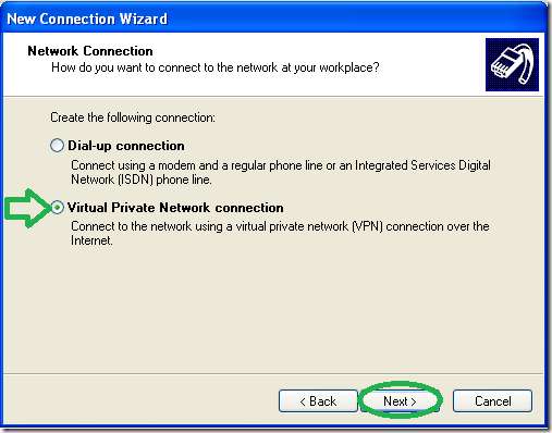 "ورچوئل پرائیوٹ نیٹ ورک کنکشن" کے اختیار کو منتخب کریں اور پھر "اگلا"۔
