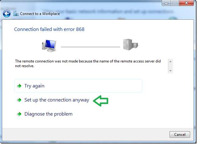 کنکشن مربوط ہونے میں ناکام ہونے کے بعد (یہ عام بات ہے) ، "ویسے بھی کنکشن کو ترتیب دیں" پر کلک کریں۔