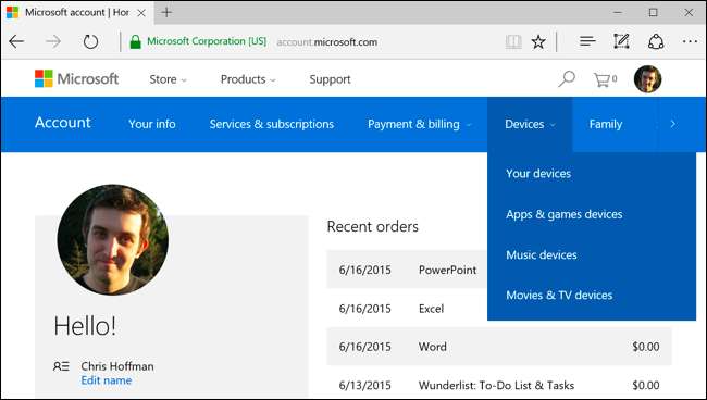 اپنی مجاز آلہ کی فہرست کا نظم کرنے کے لئے ، میں سائن ان کریں مائیکرو سافٹ اکاؤنٹ کی ویب سائٹ اکاؤنٹ کے ساتھ جو آپ اپنے ونڈوز 10 آلات پر استعمال کرتے ہیں۔ "آلہ جات" زمرہ پر کلک کریں اور اس بات پر منحصر ہوں کہ آپ کس فہرست کا نظم کرنا چاہتے ہیں۔