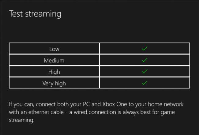 ہمارا مشورہ ہے کہ پہلے آپ اسٹریمنگ ٹیسٹ کریں۔ یہ نظام آپ کے سسٹم اور نیٹ ورک کے ل for بہترین خصوصیات کا تعین کرے گا۔ اگر آپ ایتھرنیٹ کیبل کے ذریعہ اپنے پی سی اور ایکس بکس ون کو اپنے روٹر سے جوڑتے ہیں تو یہ بہتر ہے۔
