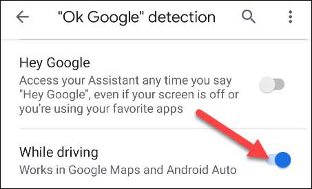 یہ اسسٹنٹ کی "ٹھیک ہے Google" کا پتہ لگانے کی ترتیبات پر لے جاتا ہے. آپ کے فون کو چھونے کے بغیر ڈرائیونگ کے دوران اسسٹنٹ استعمال کرنے کیلئے، "جبکہ ڈرائیونگ" کا اختیار ٹوگل-پر.