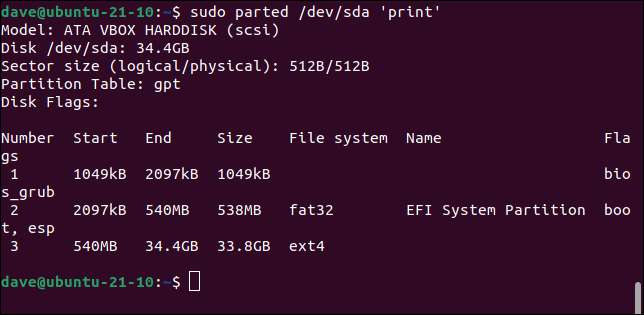 ماڈل: ATA VBOX Harddisk (SCSI) ڈسک / DEV / SDC: 21.5GB. سیکٹر سائز (منطقی / جسمانی): 512B / 512B تقسیم کی میز: MSDOS. ڈسک پرچم: نمبر شروع سائز سائز کی قسم فائل سسٹم پرچم 1 1049KB 21.5GB 21.5GB بنیادی EXT3