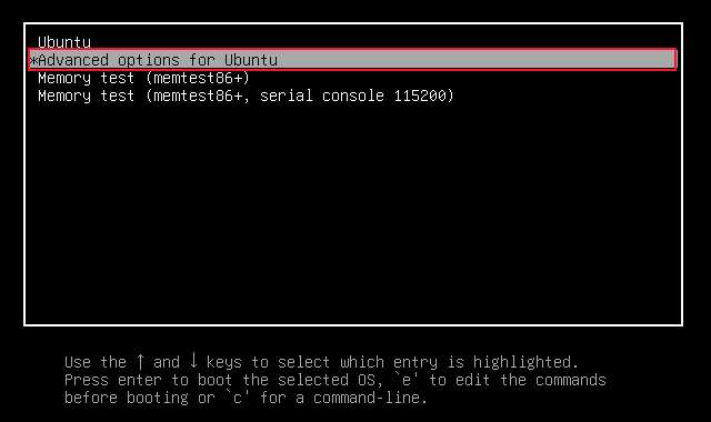 "اوپر تیر" اور "نیچے تیر" کی چابیاں کے ساتھ نمایاں بار کو منتقل کریں تاکہ "Ubuntu کے لئے اعلی درجے کے اختیارات" مینو آئٹم منتخب کیا جاتا ہے. اگلے اسکرین میں منتقل کرنے کے لئے "درج کریں" کو مار ڈالو.