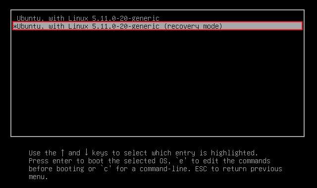 اس اختیار کو منتخب کریں جو "(وصولی موڈ) کے ساتھ ختم ہوجاتا ہے." ہماری مثال میں، یہ "ubuntu، لینکس 5.11.0-20-Generic (وصولی موڈ) کے ساتھ ہے." "درج کریں" کی چابی کو مار ڈالو.