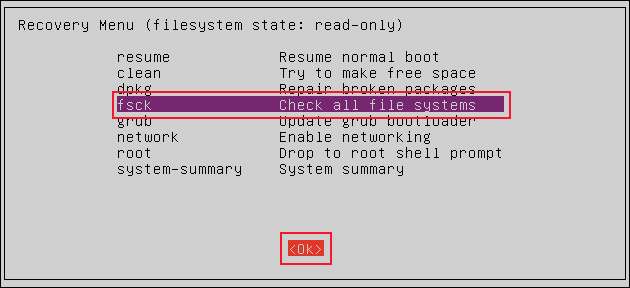 آپ وصولی مینو دیکھیں گے. منتخب کریں "FSCK تمام فائل کے نظام کو چیک کریں" اور "ٹھیک" بٹن پر روشنی ڈالنے کیلئے "ٹیب" کی چابی کو دبائیں. انٹر دبائیں."