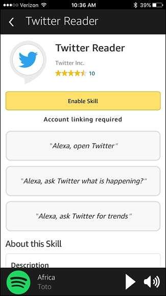 چونکہ یہ تیسری پارٹی کے الیکسا کی مہارت ہے ، لہذا آپ کو اپنے فون پر الیکٹرک ایپ کے اندر دستی طور پر انسٹال کرنا ہوگا۔ آپ پڑھ سکتے ہیں الیکساکا کی مہارتوں کو انسٹال کرنے کے طریقے سے متعلق ہماری گائیڈ ، لیکن آپ سیدھے سائڈبار مینو سے "ہنر" منتخب کرتے ہیں ، اور پھر "ٹویٹر ریڈر" تلاش کرتے ہیں۔ وہاں سے ، "اہلیت مہارت" پر ٹیپ کریں اور اس سے منسلک ہونے کیلئے اپنے ٹویٹر اکاؤنٹ میں سائن ان کریں۔