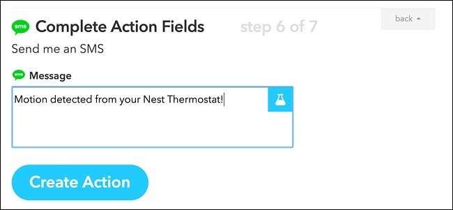 اگلا ، آپ پیغام بھیجیں گے جو ظاہر ہوتا ہے جب آپ کو موصول ہوتا ہے۔ آپ کچھ ایسی بنیادی چیز ڈال سکتے ہیں جیسے ، "آپ کے گھونسلے کے ترموسٹیٹ سے موشن کا پتہ چلا!" جب آپ کام کرچکے ہوں تو ، "ایکشن بنائیں" پر کلک کریں۔