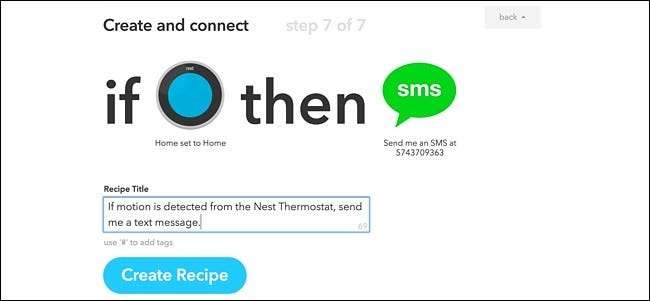 آپ کی سہولت کے ل we ، ہم نے نسخہ کو بھی پوری طرح تخلیق کیا ہے اور اسے یہاں سرایت کیا ہے – لہذا اگر آپ پہلے ہی IFTTT پر عبور رکھتے ہیں تو ، صرف نیچے "شامل کریں" کے بٹن پر کلک کریں۔ آپ کو گھوںسلا اور ایس ایم ایس چینلز کو جوڑنے کی ضرورت ہوگی اگر وہ پہلے سے موجود نہیں ہیں ، نیز ٹیکسٹ میسج الرٹس کو بھیجنے کے ل your اپنے فون نمبر میں داخل کریں۔ آپ کو "کون سا گھر؟" کے تحت ڈراپ ڈاؤن فہرست میں اپنا گھر منتخب کرنے کی ضرورت ہوگی۔
