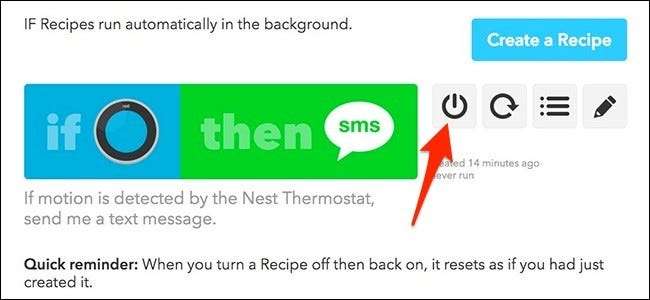 اگر آپ گھر ہیں اور یہ اطلاعات وصول نہیں کرنا چاہتے ہیں تو آپ کو IFTTT ہدایت کو بند کرنے کی ضرورت ہوگی ، جو صفحے کے اوپری حصے میں "میری ترکیبیں" پر کلک کرکے اور پھر اگلے پاور بٹن پر کلک کرکے کیا جاسکتا ہے۔ اسے آف کرنے کے لئے ہدایت پر