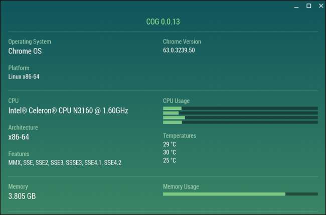 کوگ آپ کو آپ کے سی پی یو اور فن تعمیر کا نام ، آپ کے موجودہ سسٹم سی پی یو کا استعمال ، آپ کے سسٹم میں رام کی کل مقدار ، میموری کی چھوٹی مقدار ، نیٹ ورک کنکشن کی معلومات ، ڈسپلے کی وضاحتیں ، اور کچھ دیگر تفصیلات دکھاتا ہے۔ دیگر ایپس بھی اسی طرح کام کرتی ہیں ، کیونکہ صرف اتنی زیادہ معلومات موجود ہے کہ ایک ایپ کروم OS سے حاصل کرسکتی ہے اور آپ کو دکھاتی ہے۔