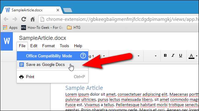 اس مقام پر ، فائل اب بھی ورڈ فائل ہے اور آپ آفس مطابقتی وضع (OCM) میں کام کر رہے ہیں۔ اسے گوگل دستاویز فائل میں تبدیل کرنے کے ل File ، "فائل" مینو میں سے "Google دستاویزات کے طور پر محفوظ کریں" کو منتخب کریں ، بالکل اسی طرح جیسے آپ نے کروم ونڈو پر ورڈ فائل کو گھسیٹنے کے بعد کیا تھا۔