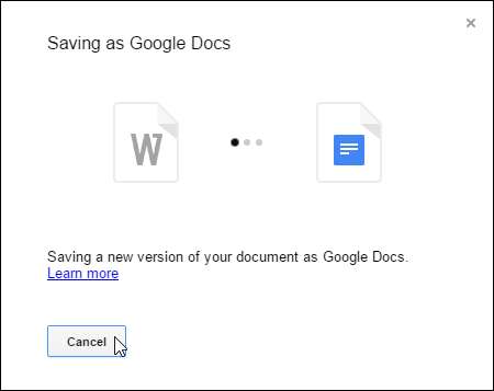 جب آپ کے Google Drive اکاؤنٹ میں دستاویز کو تبدیل اور محفوظ کرلیا جاتا ہے تو ایک ڈائیلاگ باکس ظاہر ہوتا ہے۔ آپ "منسوخ کریں" پر کلک کرکے تبادلوں کو روک سکتے ہیں۔