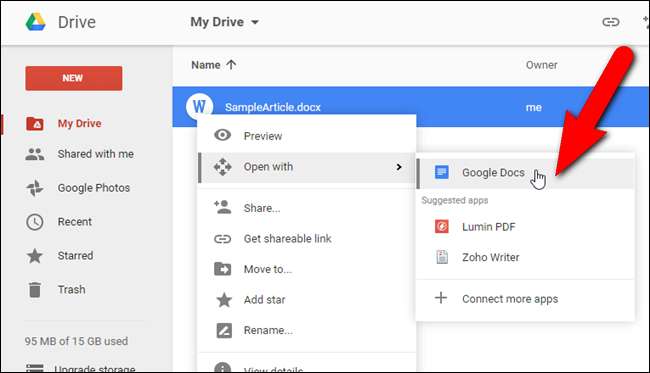 آپ کے Google ڈرائیو اکاؤنٹ میں آفس فائلوں کے ساتھ کام کرنے کا دوسرا طریقہ یہ ہے کہ وہ اپنے Google ڈرائیو اکاؤنٹ میں اپ لوڈ کریں ونڈوز کے لئے گوگل ایپ کا استعمال کرتے ہوئے ، جس سے ڈاؤن لوڈ کیا جاسکتا ہے یہاں . اگر آپ نے اپنی ورڈ فائل کو اس طرح اپ لوڈ کیا ہے تو ، آپ کر سکتے ہیں کسی براؤزر کے اندر سے اپنے گوگل ڈرائیو اکاؤنٹ تک رسائی حاصل کریں ، اور پھر Google دستاویزات میں ورڈ فائل کھولیں۔ میری مثال کے طور پر ، میں اپنے Google Drive اکاؤنٹ میں فائل پر دائیں کلک کرکے ، پاپ اپ مینو میں سے "اوپن" کو منتخب کرکے ، اور پھر سب مینیو سے "Google دستاویزات" کو منتخب کرکے اپنی ورڈ فائل کھولوں گا۔