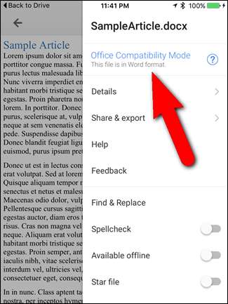 ایک بار جب دستاویز کو تبدیل کر دیا گیا تو ، "آفس مطابقتی وضع" اب مین مینو پر نہیں رہتا ہے اور کچھ آپشنز مختلف ہوتے ہیں ، جیسے کہ ہم نے جن چیزوں کا تبادلہ کیا ہے اس میں شیئر اینڈ ایکسپورٹ سب مینیو شامل ہیں۔ اب آپ اپنے Google دستاویزات کی دستاویز میں ترمیم اور ان کا اشتراک کرسکتے ہیں ، اور اگر آپ اس کا انتخاب کرتے ہیں تو اسے ورڈ دستاویز میں تبدیل کرسکتے ہیں۔