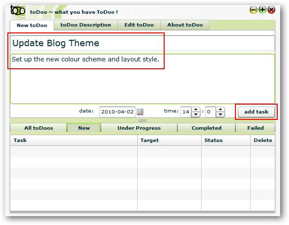 ایک بار جب آپ نے ڈو انسٹال کرلیا ہے تو شروع کرنے کے لئے سب کچھ سیدھی سیدھی ہے۔ پہلی بار جب آپ ڈو شروع کریں گے تو "مضامین اور تفصیلات والے علاقوں" کے لئے عارضی طور پر "پُر ان" ہوگا۔ صرف عارضی متن پر روشنی ڈالیں اور اپنی معلومات شامل کریں۔ نوٹ کریں کہ اگر آپ چاہیں تو آسانی سے اپنے کاموں کے لئے کسٹم کی تاریخ اور وقت "تفصیلات ایریا" کے نیچے مقرر کرسکتے ہیں۔