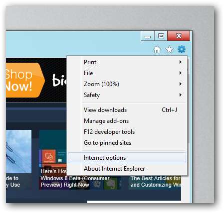 انٹرنیٹ ایکسپلورر جو سیٹنگیں استعمال کرتے ہیں وہ انٹرنیٹ آپشن ڈائیلاگ کے ذریعے کنٹرول کیے جاتے ہیں ، جس کو IE کے ڈیسک ٹاپ ورژن سے پہنچا جاسکتا ہے ، لہذا آگے بڑھیں اور اسے لانچ کریں ، پھر ٹولز کے بٹن پر کلک کریں اور انٹرنیٹ آپشنز کو منتخب کریں۔