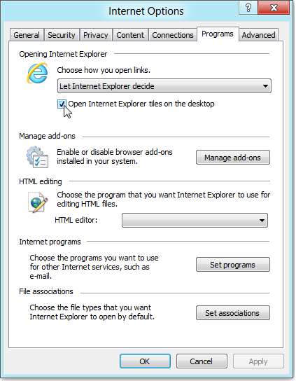 اب اس باکس کو چیک کریں جو ڈیسک ٹاپ پر انٹرنیٹ ایکسپلورر ٹائل کو کھولنے کے لئے کہتا ہے۔