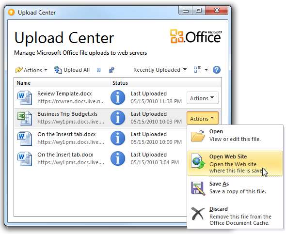 جب آپ آفس 2010 کی دستاویز کو ویب پر اپ لوڈ کرتے ہیں تو ، ان کو منظم کرنے کا ایک آسان ٹول آفس اپلوڈ سینٹر ہوتا ہے۔ یہ دیکھنے کا ایک طریقہ ہے کہ کیا اپ لوڈ ہو رہا ہے یا سرورز تک پہنچنے میں کیا ناکام ہوسکتا ہے۔