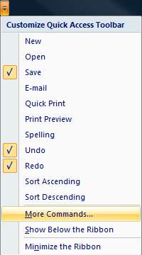 ایکسل 2007 کھولیں اور فوری رسائی ٹول بار کے ساتھ نیچے والے تیر پر کلک کریں۔