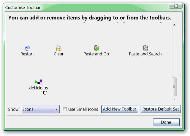 ایک بار جب آپ ایکسٹینشن انسٹال کرلیتے ہیں تو آپ کو سب سے پہلے جس چیز کی ضرورت ہوگی وہ ہے "ٹول بار ونڈو کو کسٹمائز کریں" کھولنا تاکہ آپ اپنے براؤزر میں "پوسٹ 2 ڈیل.icio.us ٹول بار بٹن" شامل کرسکیں۔