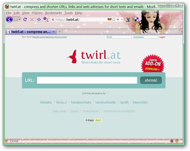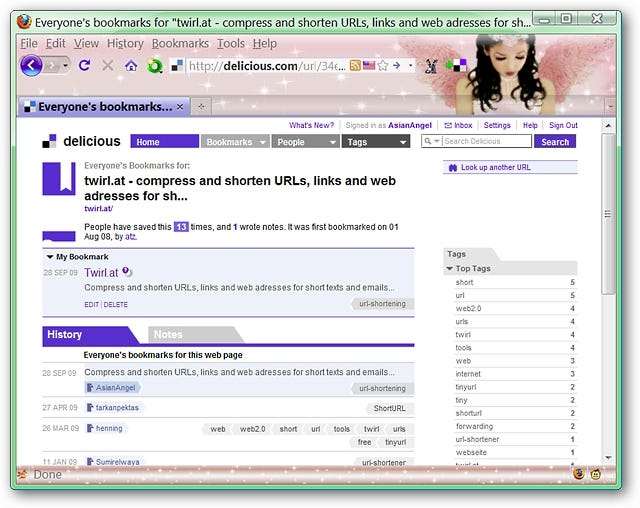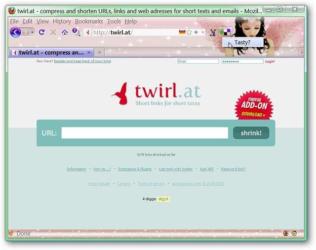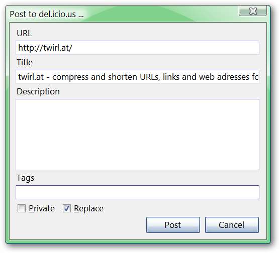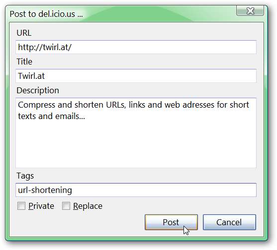 ہماری مثال کے طور پر ہم نے twirl.at (URL کو مختصر کرنے والی خدمت) کے لئے مزیدار پر ایک بُک مارک پوسٹ کرنے کا فیصلہ کیا ہے۔