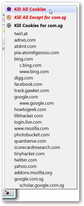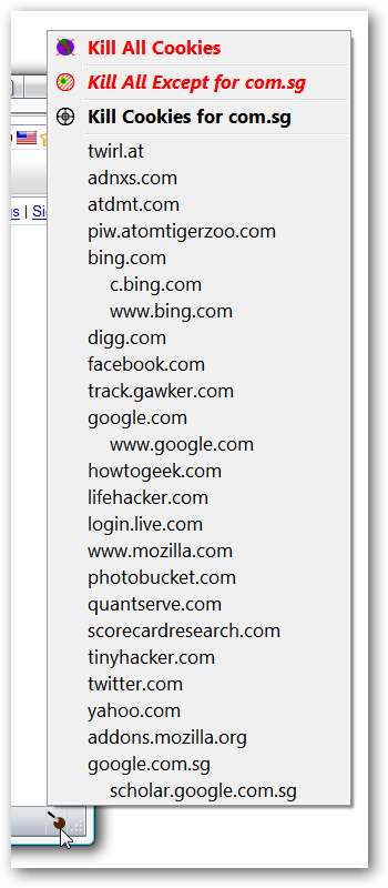 اگر آپ نے "اسٹیٹس بار آئیکون" پر کلک کیا تو آپ کو اپنے براؤزر کی کوکیز کی موجودہ فہرست نظر آئے گی۔ کسی خاص کوکی لسٹنگ پر کلک کرنے سے وہ کوکی آپ کے براؤزر سے ہٹ جائے گی۔ سب سے اوپر تین کمانڈوں پر غور کریں…