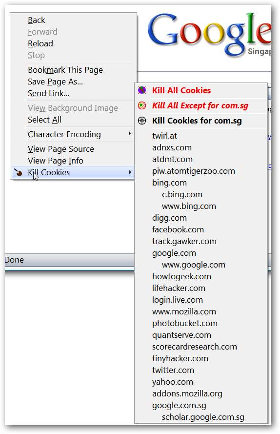 اپنی مثال کے طور پر ہم نے کوکیز کو حذف کرنے کے لئے "اسٹیٹس بار آئیکن" استعمال کرنے کا فیصلہ کیا ہے۔ "google.com.sg" لسٹنگ پر کلک کرکے ہم بھی "سب کوکی" (انڈٹڈ لسٹنگ) کو حذف کرنے میں کامیاب ہوگئے۔