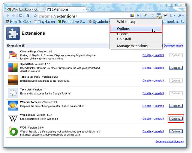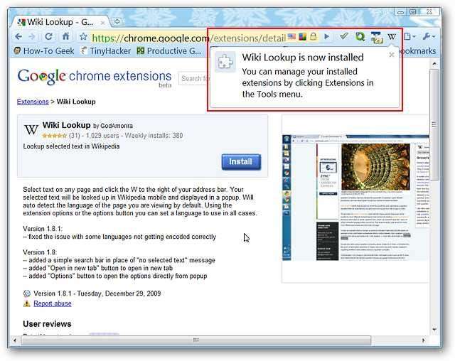 جیسے ہی آپ نے توسیع کو انسٹال کرنے کے بعد آپ کو اپنا نیا "ویکی لوک اپ ٹول بار بٹن" اور ایک مختصر توسیع کے انتظام کا پیغام نظر آئے گا۔