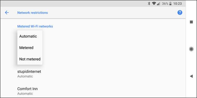 آپ Android کو بھی یہ کہہ سکتے ہیں کہ وہ مخصوص Wi-Fi نیٹ ورکس کا علاج کریں جیسے وہ سیلولر نیٹ ورک ہیں۔ ایسا کرنے کے لئے ، ڈیٹا استعمال مینو میں وائی فائی سب سیکشن کے تحت "نیٹ ورک پابندیوں" کے اختیار پر ٹیپ کریں ، پھر وائی فائی نیٹ ورک کو "میٹرڈ" کے بطور سیٹ کریں۔ یہ اینڈرائیڈ کو بنیادی طور پر اسی نیٹ ورک کے ڈیٹا کو اسی طرح سے محدود کرنے کے لئے کہتا ہے جس طرح اس سیلولر نیٹ ورکس پر ہوتا ہے۔ سپر دانے دار کنٹرول!