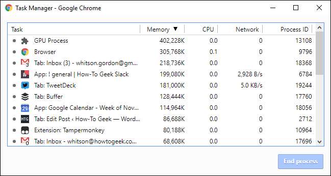 . اگر آپ شفٹ + ٹیب دبائیں تو کروم کا اپنا ٹاسک مینیجر بھی ہوتا ہے ، لہذا آپ دیکھ سکتے ہیں کہ ہر ایک ٹیب اور توسیع میں کتنی رام استعمال ہوتی ہے۔ اگر آپ ٹائپ کریں گے تو فائر فاکس میں قدرے زیادہ تکنیکی ہے