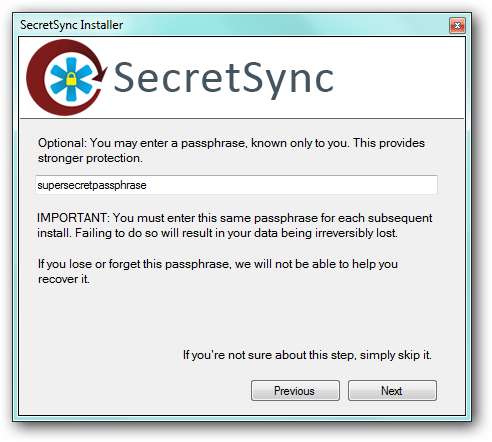 اپنی فائلوں کو مزید تحفظ فراہم کرنے کے ل you آپ ایک پاسفریز فراہم کرسکتے ہیں جو خفیہ کاری کی کلید سکرینسیئنک فراہم کرتا ہے کے علاوہ استعمال ہوگا۔ یہ پاسفریز بازیافت نہیں ہے لہذا اگر آپ اسے کھو دیتے ہیں تو آپ اپنی فائلیں بازیافت نہیں کرسکتے ہیں۔
