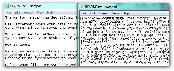 پہلے سے طے شدہ طور پر آپ کے پاس اپنے خفیہ کردہ فولڈر میں README.txt فائل ہوگی۔ یہ تصدیق کرنے کے لئے کہ آپ کی فائلوں کو کوکرپٹ کیا جارہا ہے ، README.txt فائل کو سیدھے سیکریٹ سِنک فولڈر (بائیں) میں سے کھولیں اور اسے ڈراپ باکس \ .SecretSync_tunnel_ روٹ فولڈر (دائیں) سے بھی کھولیں۔ آپ نیچے دیکھ سکتے ہیں کہ جس فائل کو ڈراپ باکس میں مطابقت پذیر کیا جارہا ہے وہ مکمل طور پر پڑھنے کے قابل نہیں ہے کیونکہ اس کو مرموز کاری کی گئی ہے۔