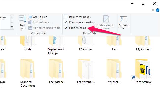 اگر آپ کو بعد میں کبھی اس تک رسائی حاصل کرنے کی ضرورت ہو تو ، آپ فائل ایکسپلورر میں ویو مینو پر کلک کرکے اور "پوشیدہ اشیاء" کے خانے کو چیک کرکے پوشیدہ فائلیں دکھا سکتے ہیں۔ (ونڈوز 7 میں ، آپ کو منظم> فولڈر اور تلاش کے اختیارات پر جانا پڑے گا اور اس کے بجائے ویو ٹیب پر "پوشیدہ فائلیں ، فولڈرز ، اور ڈرائیوز دکھائیں" کو منتخب کرنا پڑے گا۔) آپ کر سکتے ہیں پوشیدہ فائلیں اور فولڈرز دکھانے کے بارے میں مزید پڑھیں .