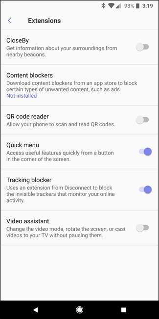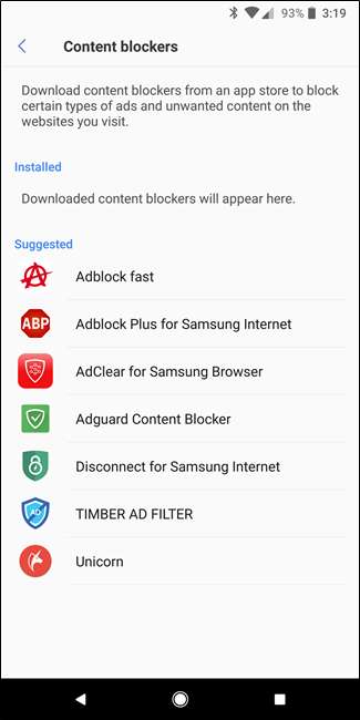 لیکن جو واقعی میں سام سنگ انٹرنیٹ براؤزر کو نمایاں کرتا ہے وہ اس کی اختیاری توسیعات ہیں۔ اگرچہ ایک ٹن انتخاب دستیاب نہیں ہے ، اس براؤزر میں کچھ قابل ذکر ایڈونس موجود ہیں ، جیسے ٹریکنگ بلاکر اور متعدد مواد کو روکنے والے (پڑھیں: اشتہار بلاکر) یہاں ایک بات قابل توجہ رکھنے والی بات ، اگرچہ ، یہ ہے کہ موبائل پر ایڈ بلاکر تھوڑا سا مختلف ہوتے ہیں تو وہ ڈیسک ٹاپ پر ہوتے ہیں ، لہذا مکمل اشتہار کو مسدود کرنے سے کچھ (متعدد) ویب سائٹوں کو توڑ سکتا ہے۔