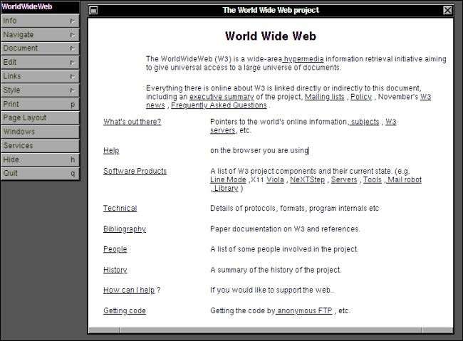 کی طرح، CERN کے میزبانوں ایک تھا آپ سب سے پہلے براؤزر کا استعمال کیا ہے کے لئے ایک احساس حاصل کرنے کے لئے چاہتے ہیں تو پہلی ویب براؤزر کے تخروپن آپریٹنگ سسٹم یہ NeXTSTEP میں شائع ہوا کے طور پر، اور تم آج اپنے براؤزر میں اسے چلا سکتے ہیں. سکرین کے کنارے پر مینو وقت NeXTSTEP کے کنونشنوں مندرجہ ذیل ہے. بہت سے Next کمپیوٹرز اعلی قرارداد مونوکروم مانیٹر کے ساتھ بھیج دیا ہے کیونکہ یہ سرمئی رنگوں میں پیش کی گئی ہے.
