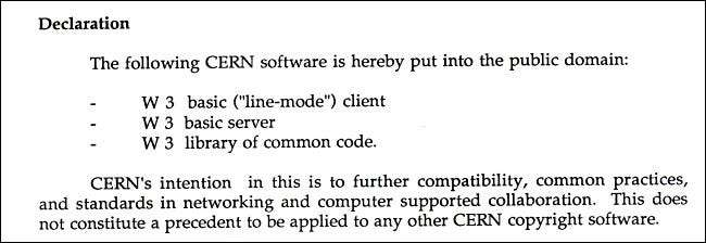 ٹم برنرس لی 1991 میں عوام کے لئے ویب کھولا بعد، نیا ذریعہ تیزی سے اضافہ ہوا . خاص طور پر، چند اہم سنگ میل ہے 30 اپریل 1993. میں جگہ لے لی، CERN سائیٹ کے بنیادی ٹیکنالوجیز رہا کر دیا عوامی ڈومین میں ، ویب کی راہ ہموار رائلٹی فری معیار کے کسی کو بلا معاوضہ استعمال کر سکتے ہیں بننے کے لئے. یہ بہت بڑا تھا.