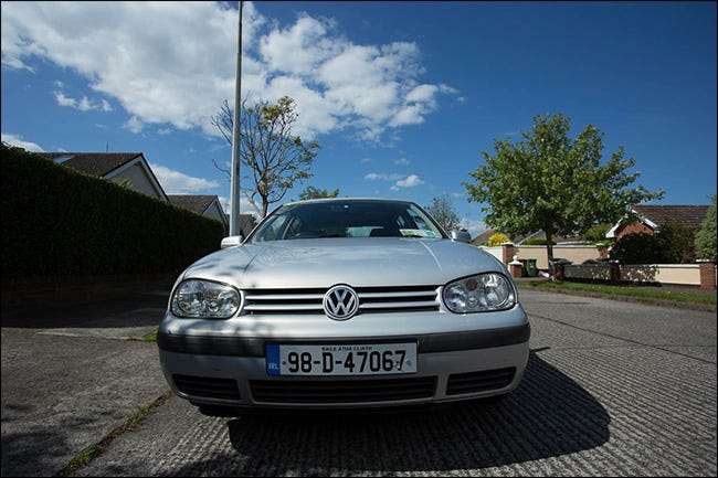 یہ ایک وسیع زاویہ والے عینک کے ساتھ لیا گیا تھا ، اور آپ دیکھ سکتے ہیں کہ کار کس طرح مسخ ہوگئی ہے۔ یہ واقعی ایک عجیب و غریب تناظر ہے۔ دیوار سے دائیں جو دوسری دو تصاویر میں نظر آئیں پس منظر میں اب بہت دور ہے۔