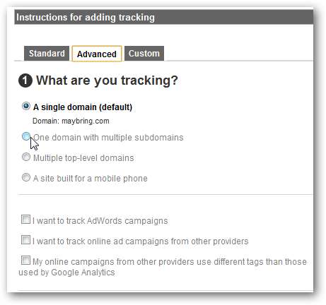 اگر آپ ایک اعلی درجے کی سیٹ اپ ، جیسے متعدد ذیلی ڈومینز یا ایک موبائل ویب سائٹ کے ساتھ ڈومین تلاش کرنا چاہتے ہیں تو ، منتخب کریں اعلی درجے کی خصوصی تجزیات سے باخبر رہنے والے کوڈ کیلئے ٹیب۔