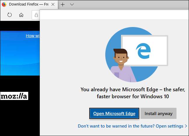 ونڈوز 10 اب آپ کو "انتباہ کرتا ہے" کہ جب آپ ڈاؤن لوڈ کرتے ہو تو آپ کروم یا فائر فاکس انسٹال نہ کریں۔ مائیکرو سافٹ نے ایج کو بہت سے پریشان کن طریقوں میں سے ایک ہے ، جس میں مائیکرو سافٹ کی بڑھتی مایوسی کے باوجود صرف 4 فیصد مارکیٹ شیئر ہے۔